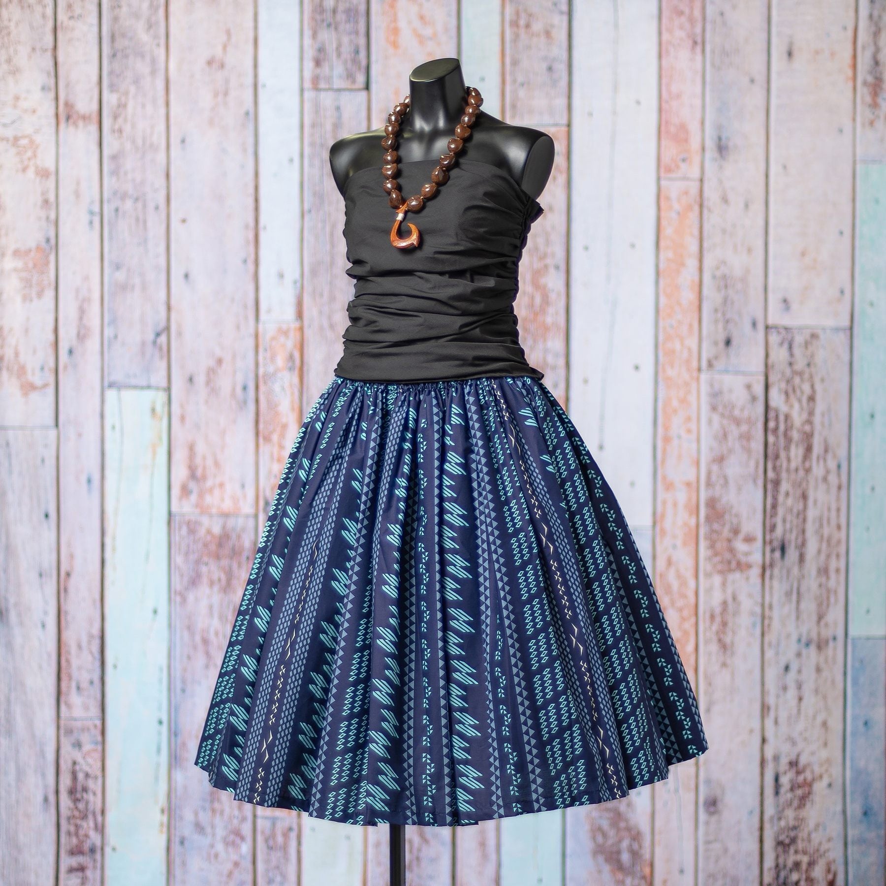 Made in Hawaii の輸入パウです。ネイビーに水色でタパ柄が縦に並ぶように描かれており、クールな印象です。