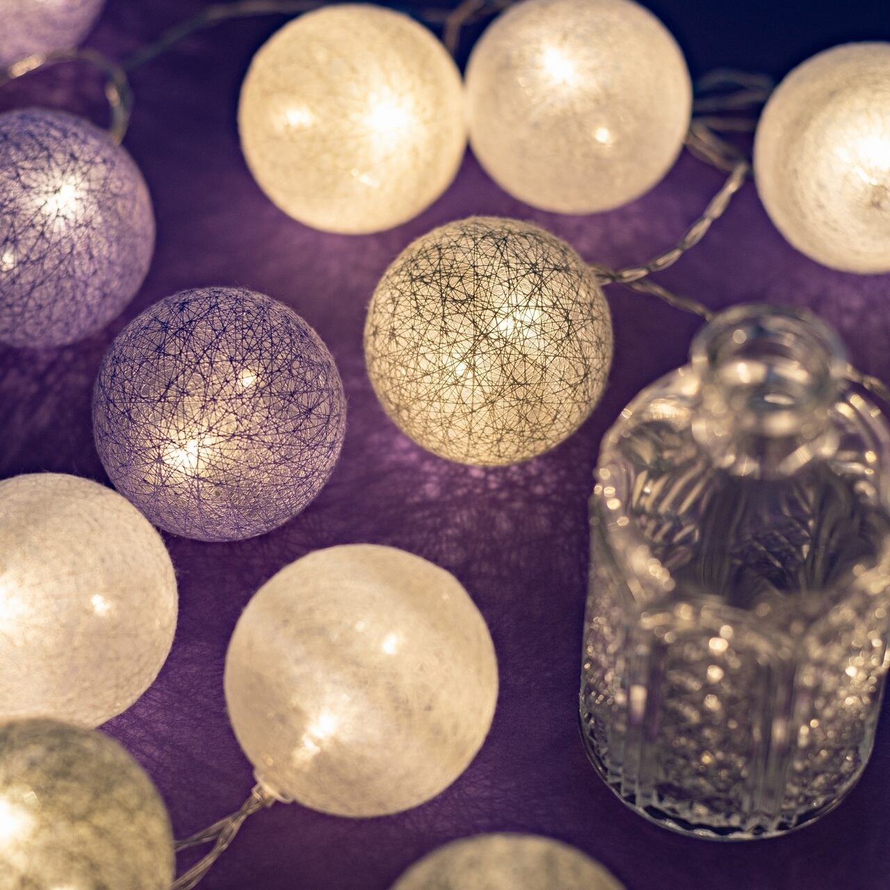 あたたかみのある光がおしゃれなLEDイルミネーションライトです。コットンボールの隙間からもれる光が柔らかく、お部屋を素敵な空間にしてくれます。お色は白とグレーとパープルの組み合わせで大人の雰囲気です。