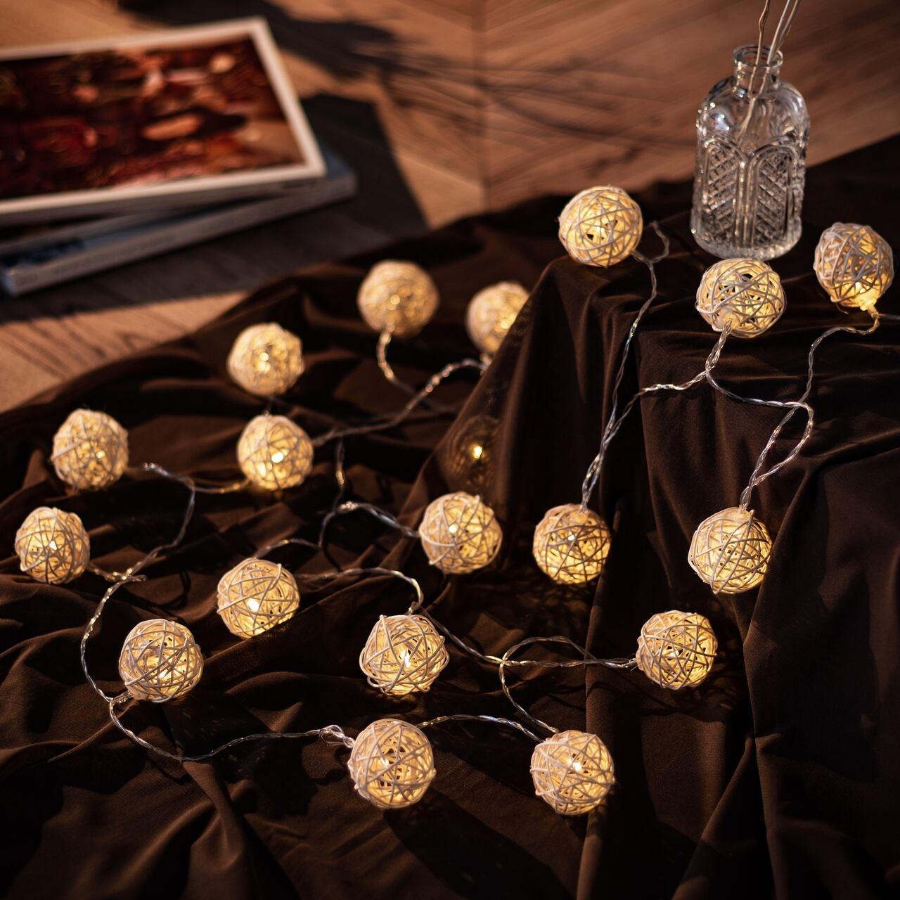 ハワイや西海岸風のインテリアにも合わせやすいラタン風のイルミネーションです。ボールの隙間からもれる光が柔らかく、お部屋を素敵な空間にしてくれます。LEDなのでキャンドルのように火を使わず、安全です。