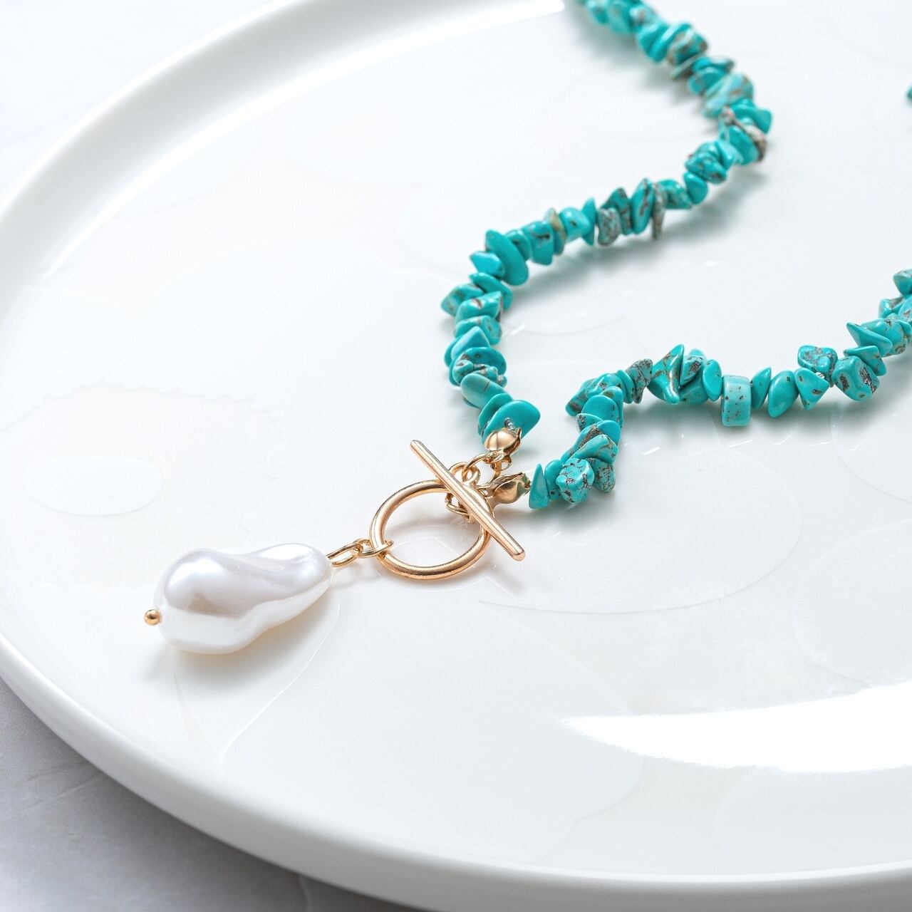 バロックパール風のチャームとターコイズの組み合わせがおしゃれなチョーカーです。
